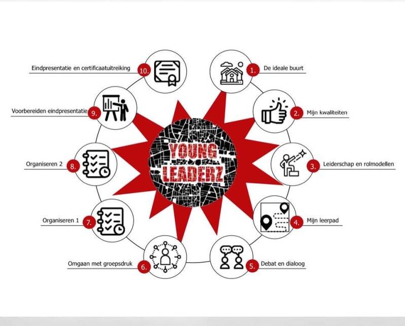 Young Leaders bestaat uit 10 modulen waarin ze aan de slag gaan met een trainingsdeel en een activiteitendeel. De jongeren krijgen gezamenlijk als groep een budget om een sociaal maatschappelijke activiteit te organiseren door de groep zelf bedacht en georganiseerd. Uiteraard ontvangen ze vanuit ons ondersteuning en begeleiding.